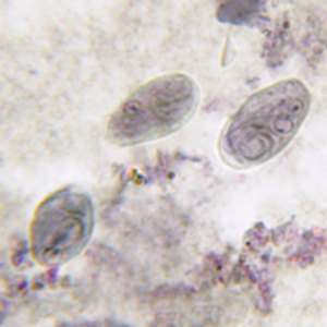 Les kystes de Giardia intestinalis sont ovales, colorés au Lugol, à paroi fine. Ils mesurent 8 à 12 μm et possèdent deux à quatre noyaux ainsi que des flagelles (Strait et al., 2012).