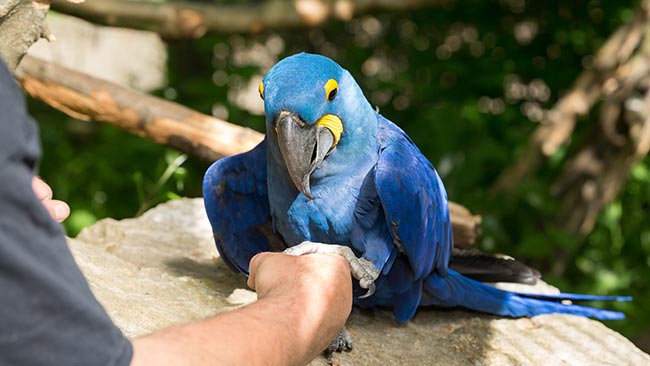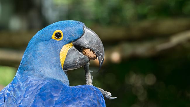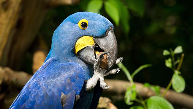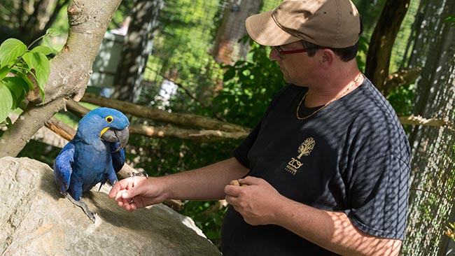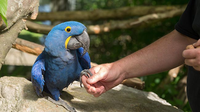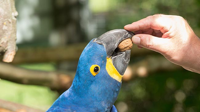 Leur bec court mais très puissant est très efficace pour broyer les grosses graines et attraper les fruits dont ils se nourrissent. Ils se servent aussi parfois de leur bec comme d’une troisième patte afin de se déplacer plus facilement sur les branches ou, au zoo, sur le grillage. Ces animaux très intelligents ont besoin d’une alimentation saine et très variée et un soin particulier leur est apporté par les soigneurs animaliers du zoo.